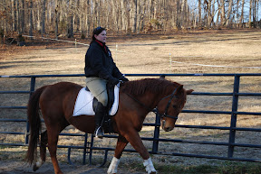 Afterwards Heather and I got our boys out and saddled up. I had Chuck take some pics and video, since I needed to see what he looked like from the ground so I knew what all I need to focus on during our workouts. I also just wanted some pictures of me and my boy together! I found myself during our ride together pleasantly surprised by Pilgrims willingness to move forward and starting to accept the contact of my hands. Patience has never been much of a virtue of mine, although with horses it's one of the most important things you must possess. All too often I have seen horses where there training has been rushed by people who felt the horse "should be able to perform this by now", instead of focusing on whether the horse is ready to perform a maneuver. With Pilgrim, I knew I had a challenge in front of me. Not only just in conformation (he has very classical stock QH conformation and build slightly downhill....perfect for western pleasure and hence why I bought him, but a curse in dressage), but I started Pilgrim's training in western pleasure. For those unfamiliar, I ask the horse to stretch down into the bit, but their reward is my release of contact. The horse is rode with little bit contact and is primarily ridden with your seat and legs. So while many of these things will benefit us in the dressage world, I needed to teach Pilgrim to accept the contact with the bit as a constant. From my research, I've found other QH people struggle with this very thing and often caution you not to get frustrated and try to rush or force it. So I've been keeping my contact light and soft and reminding myself every time he braces and is stiff that we are not failing, just taking our time. It appears that Pilgrim decided to remind me that if you have patience, it will pay off....even more so because I know I didn't force him. So, while he kept dying out at the canter today, I'm not complaining. For the first time I had a focused horse that was driving forward and soft and supple enough to actually start accepting contact! Was he still bracing at times? Absolutely! But it's very hard work once they start lifting their back, and we took lots of walk breaks, worked lots of stretching frame, and he got lots of treats when we were done! For the first time I feel like I might actually be doing something right and we may have a future in the sport!